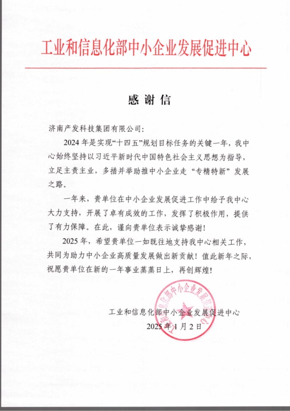近日,濟(jì)南產(chǎn)發(fā)科技集團(tuán)有限公司(以下簡稱“科技集團(tuán)”)收到一封來自工業(yè)和信息化部中小企業(yè)發(fā)展促進(jìn)中心(以下簡稱“促進(jìn)中心”)的感謝信,信中對(duì)科技集團(tuán)在2024年中小企業(yè)發(fā)展促進(jìn)工作中發(fā)揮積極作用、提供有力保障表示由衷感謝。
